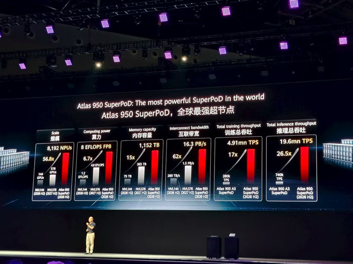 “Atlas950超节点,至少在未来多年都将是全球最强算力的超节点,并且在各项主要能力上都远超业界主要产品。其中,相比英伟达同样将在明年下半年上市的NVL144,Atlas950超节点卡的规模是其56.8倍,总算力是其6.7倍,内存容量是其15倍,达到1152TB;互联带宽是其62倍,达到16.3PB/s。即使是与英伟达计划2027年上市的NVL576相比,Atlas950超节点在各方面依然是领先的。”华为轮值董事长徐直军称。