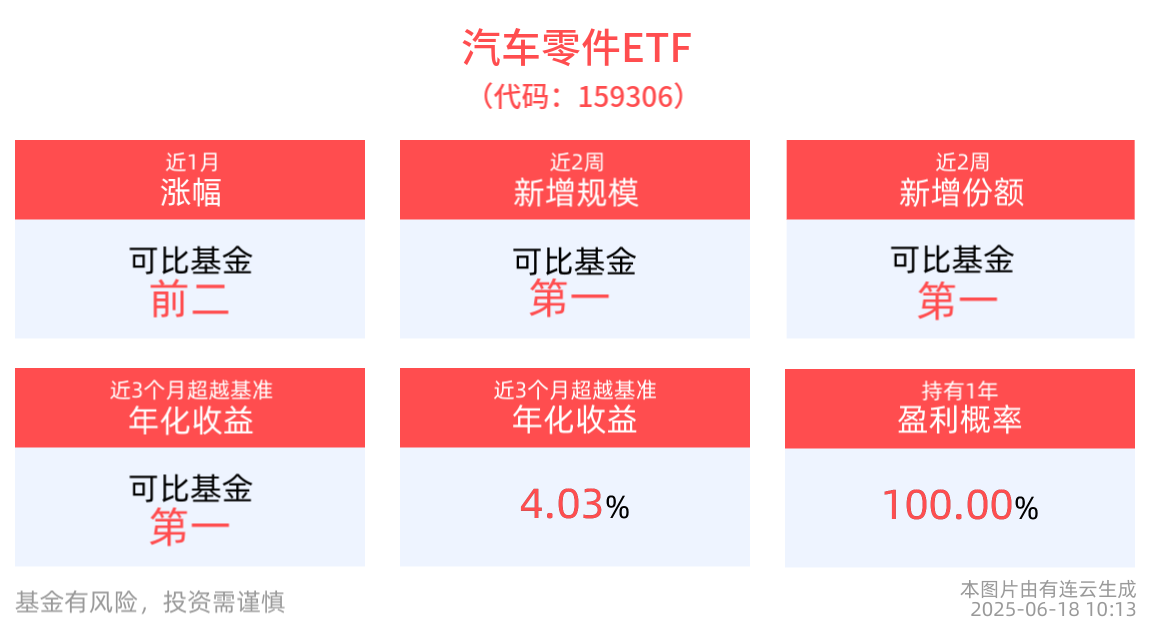 份额方面,汽车零件ETF近2周份额增长300.00万份,实现显著增长,新增份额位居可比基金1/4。